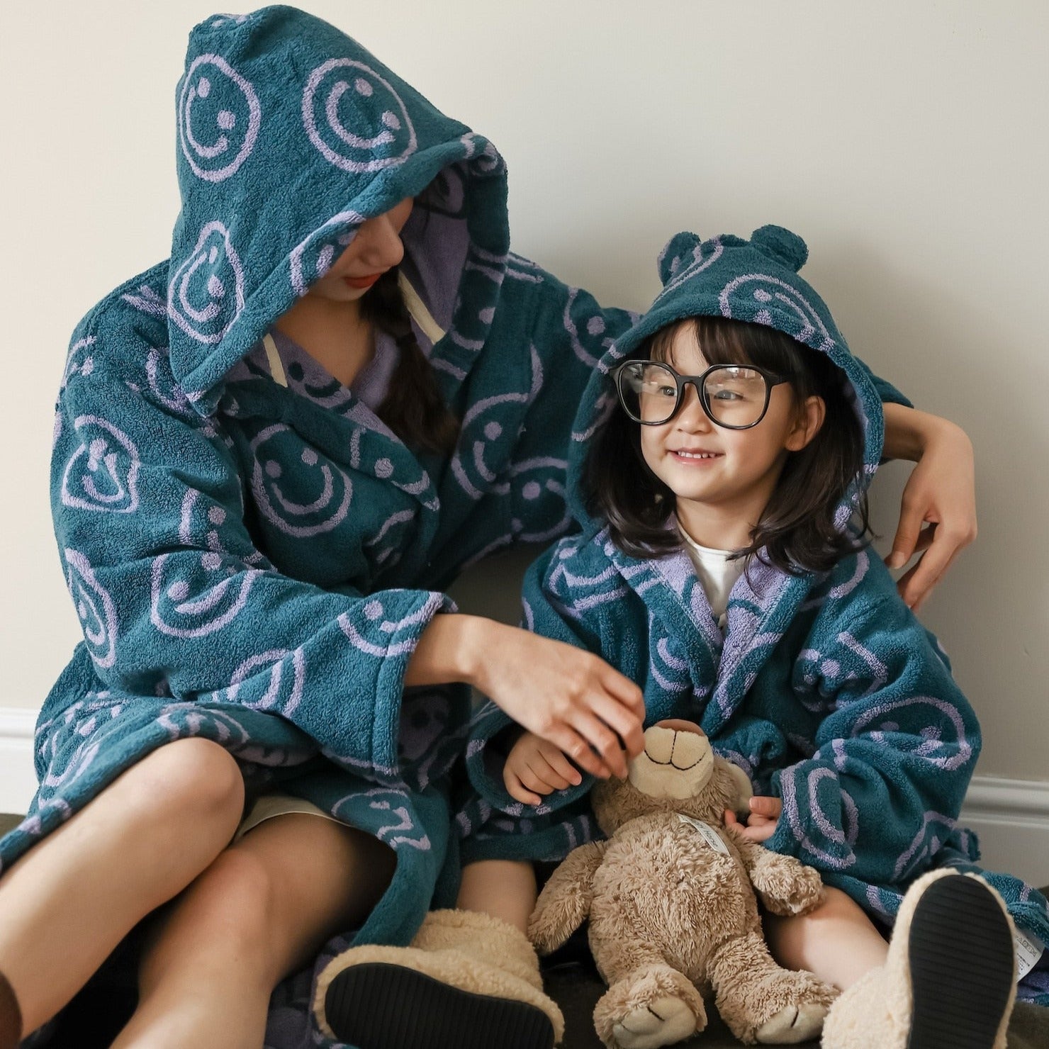 The All Smiles Robe makes bath time ultra groovy for both you and your kiddo. Available in two adorable color combos. Its one-size-fits-most design comes in both adult and kid sizes.